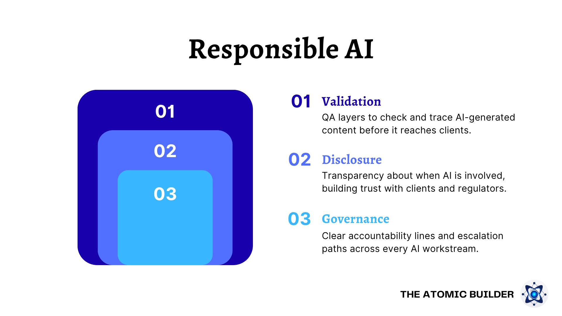 The challenge isn’t writing those principles - it’s making them real: ensuring they shape how teams design prompts, validate outputs, and sign off deliverables.