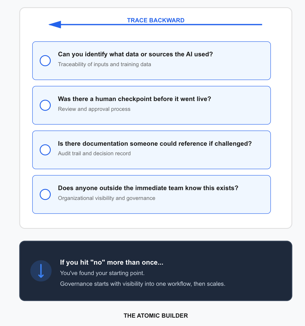 Pick your highest-stakes AI workflow - the one touching clients, revenue, or compliance. Then trace a single output backward: