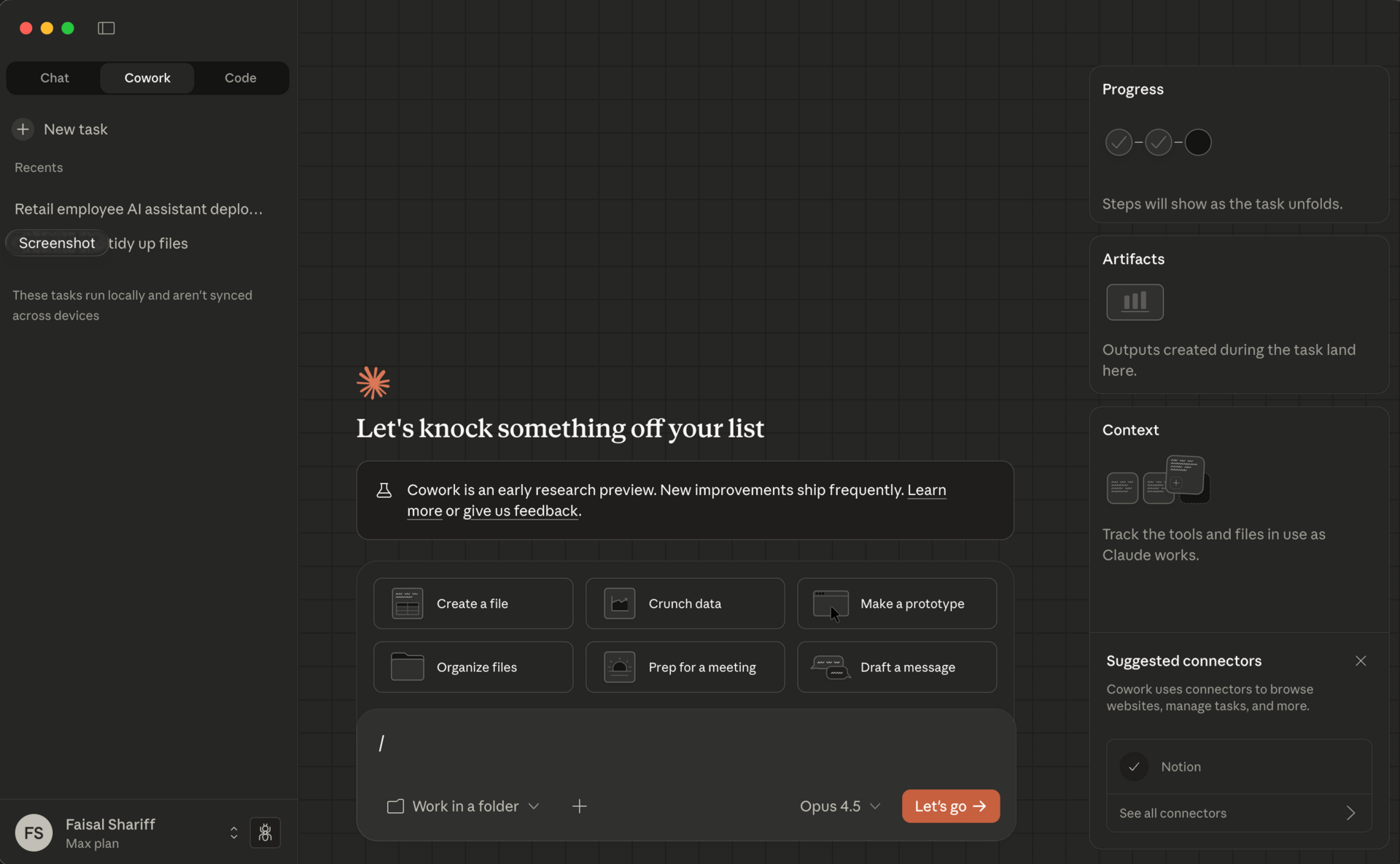 Cowork is available on Claude Pro ($20/month) and Max plans. It's Mac only for now, with Windows coming. It's a research preview - Anthropic built this in a week and a half, and there are rough edges.