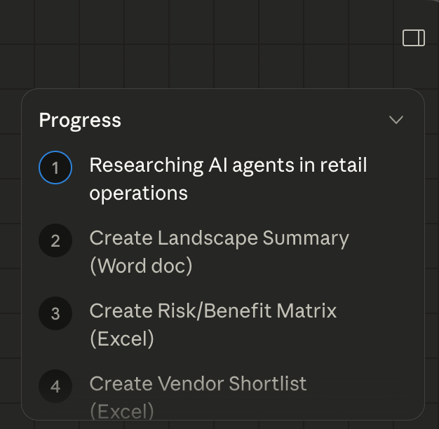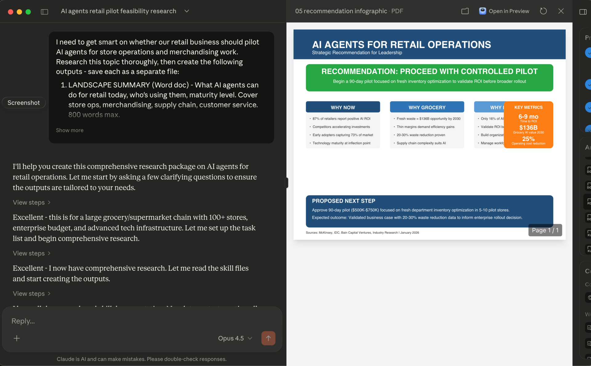 Say you need to get smart on a decision fast. Your retail business is evaluating whether to pilot AI agents for store operations. You have a leadership meeting in two days. Normally this is a week of scattered research and late nights formatting slides.